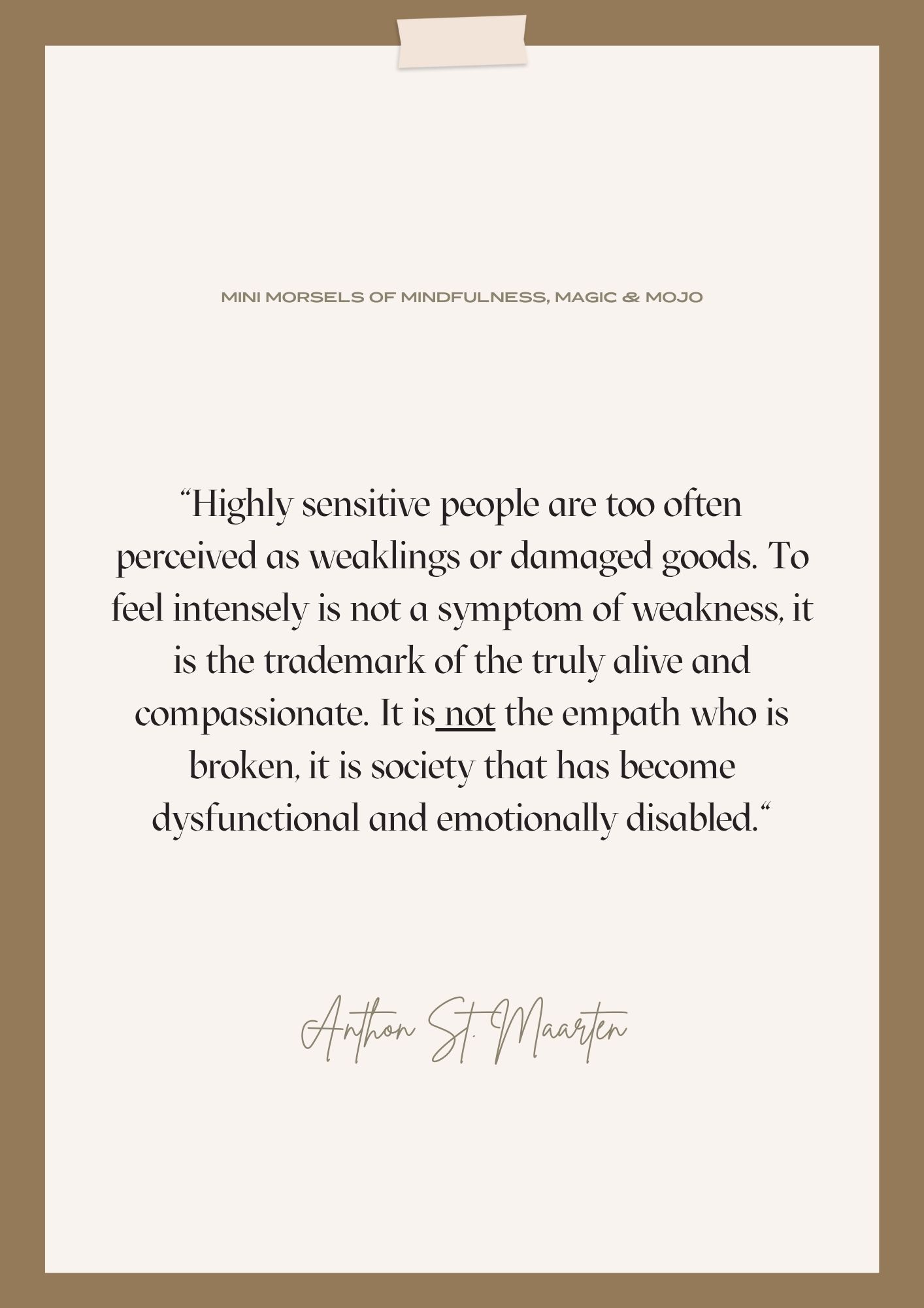 “Highly sensitive people are too often perceived as weaklings or damaged goods. To feel intensely is not a symptom of weakness, it is the trademark of the truly alive and compassionate. It is not the empath who is broken, it is society that has become dysfunctional and emotionally disabled.”