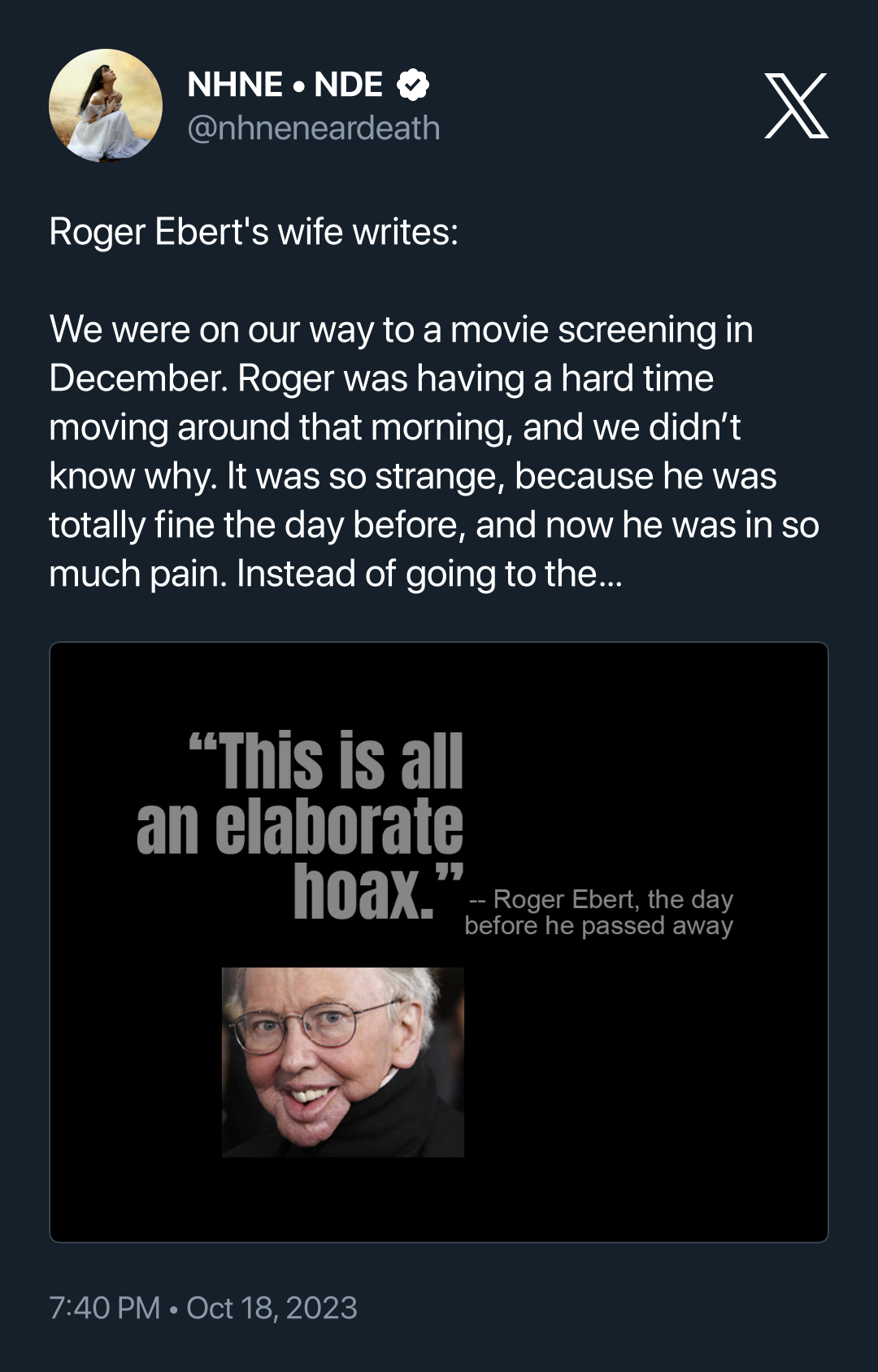 A beautiful account of Roger Ebert’s last moments – including what he described to his wife as a state of “moving between this world, and the next” for several weeks prior to his death. For those of us who remember him well, Roger Ebert was a well known atheist who didn’t believe in an afterlife, and yet, his last few months, as told by his wife, seem to suggest he had a profound change of heart, and a profound set of spiritually transformative experience on the way out of this world, and into whatever it is, that awaits us all. Really well worth reading for both believers and the curious but not yet convinced as well!