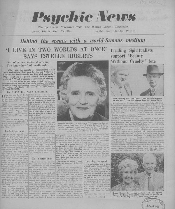 Estelle Roberts was regarded by the British Spiritualist Movement as one of its finest exponents of mediumship in the 20th century. Born May 10, 1889, she claimed to have first seen a spirit at the age of ten, constantly hearing voices and seeing apparitions at school, though her parents scolded her for having a too-vivid imagination After working as a waitress to support her three children following her first husband’s death, a neighbor persuaded her to attend a Spiritualist service, where the clairvoyant told her she was a born medium with great work to do in the world.